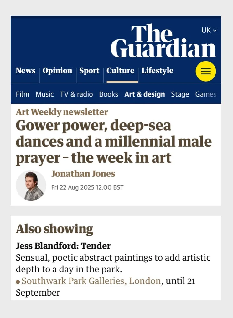 I am so grateful for this amazing review of my work by Jonathan Jones in The Guardian (Saturday 23rd August, 2025). And for recommending Tender as one of the 5 exhibitions to see in the Art Weekly newsletter. Still pinching myself…